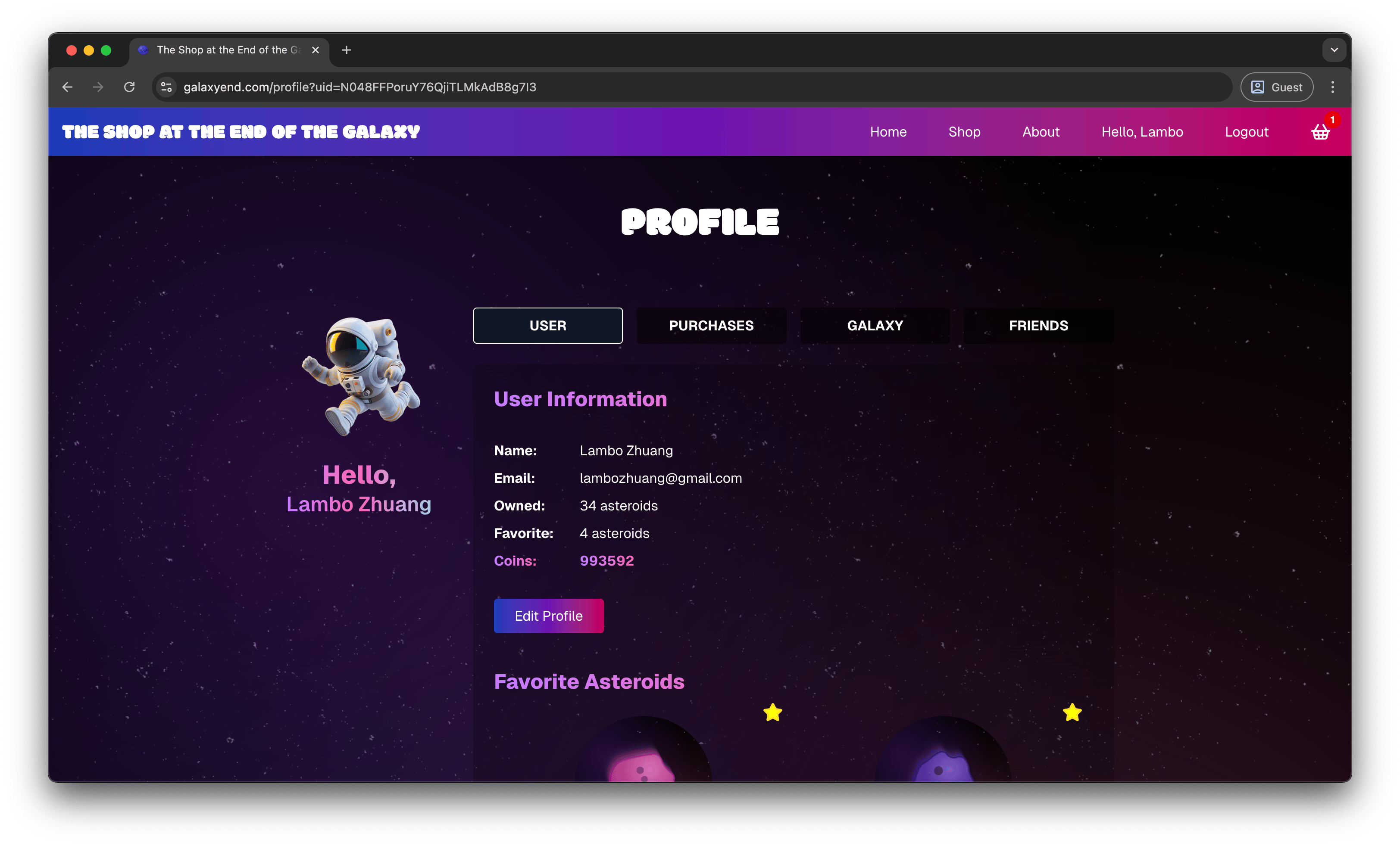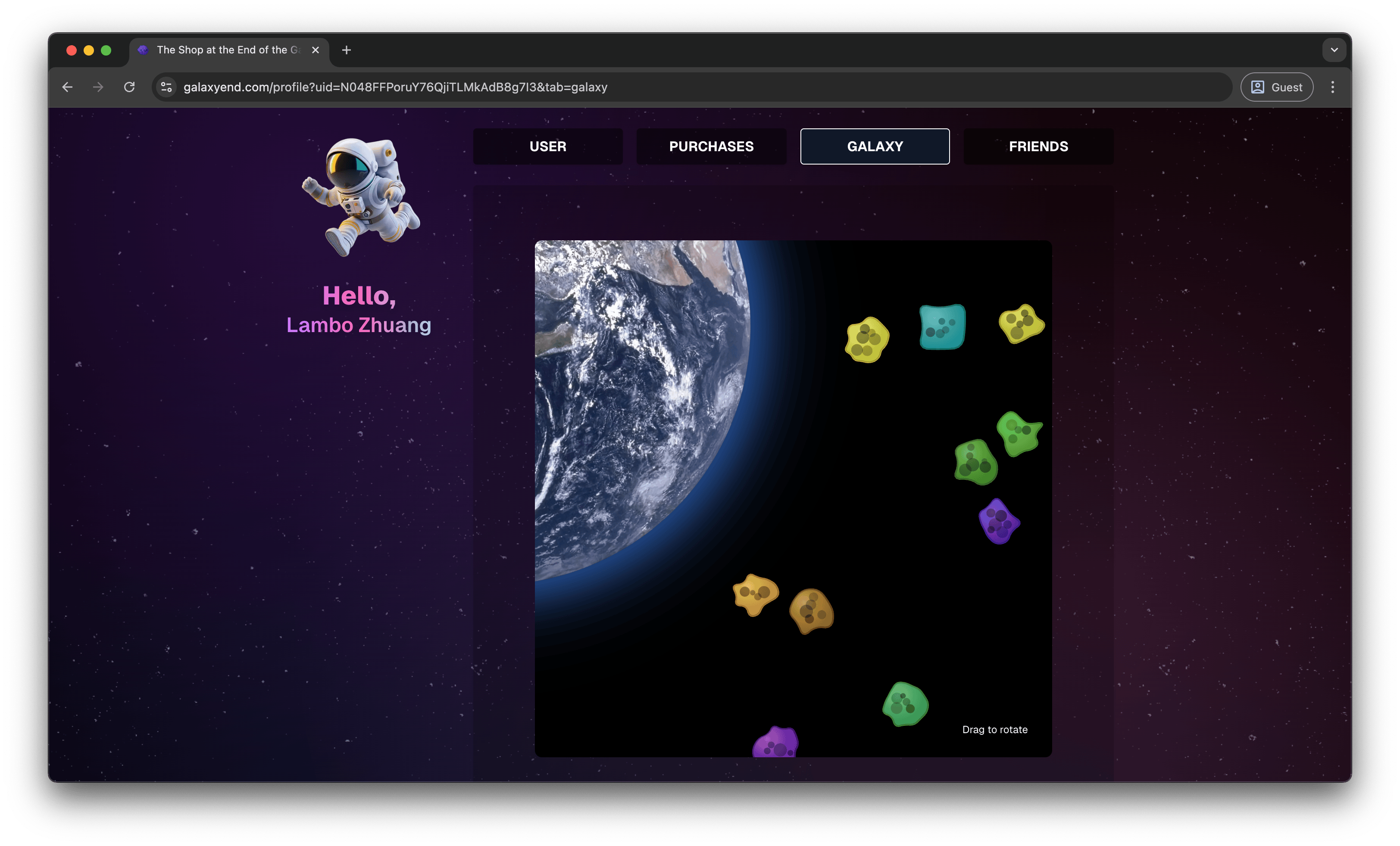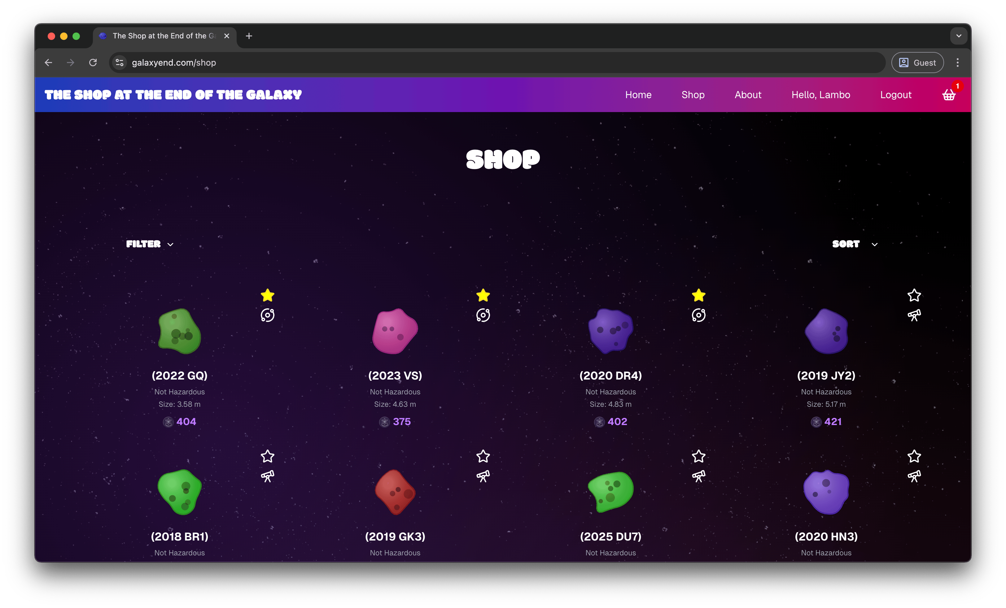 Users can explore a catalogue of real asteroids, each uniquely rendered as a stylized SVG “space rock” generated deterministically from NASA’s Near-Earth Object API data. Every asteroid has its own CosmoCoin price calculated from its physical properties like size, brightness, velocity, and rarity.